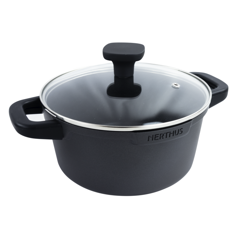 La Cacerola Alta de Aluminio Fundido de Nerthus combina resistencia, eficiencia y un revestimiento antiadherente premium Quantanium, libre de PFOA, que refuerza la durabilidad y evita que los alimentos se peguen incluso con un uso intensivo.