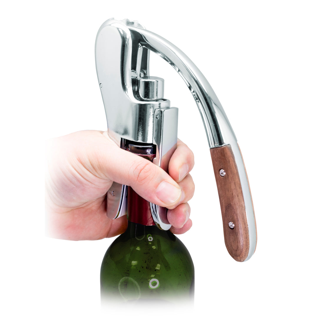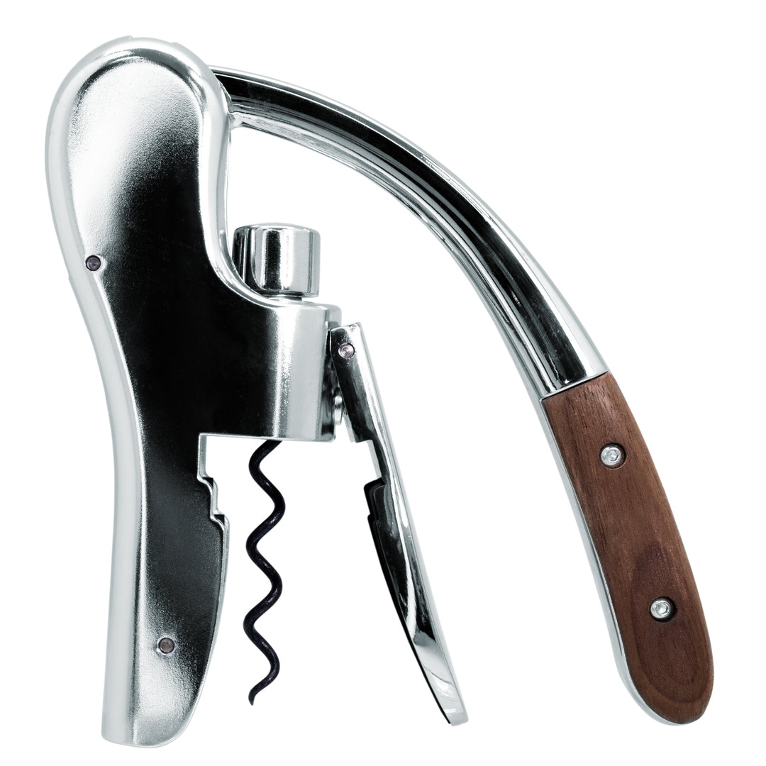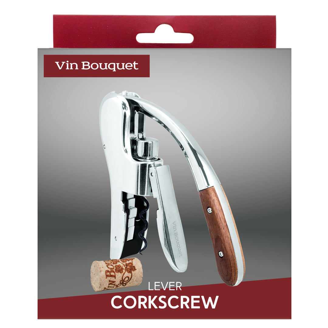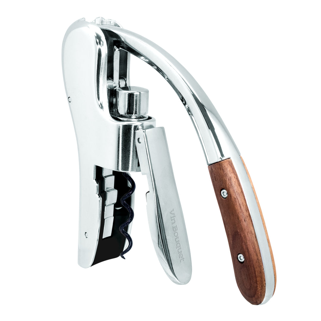 El sacacorchos de palanca Vin Bouquet combina fuerza, precisión y elegancia en un solo accesorio. Su mecanismo de palanca permite extraer los corchos de manera rápida y sin esfuerzo, mientras que el acabado cromado y los detalles en madera aportan un toque sofisticado.