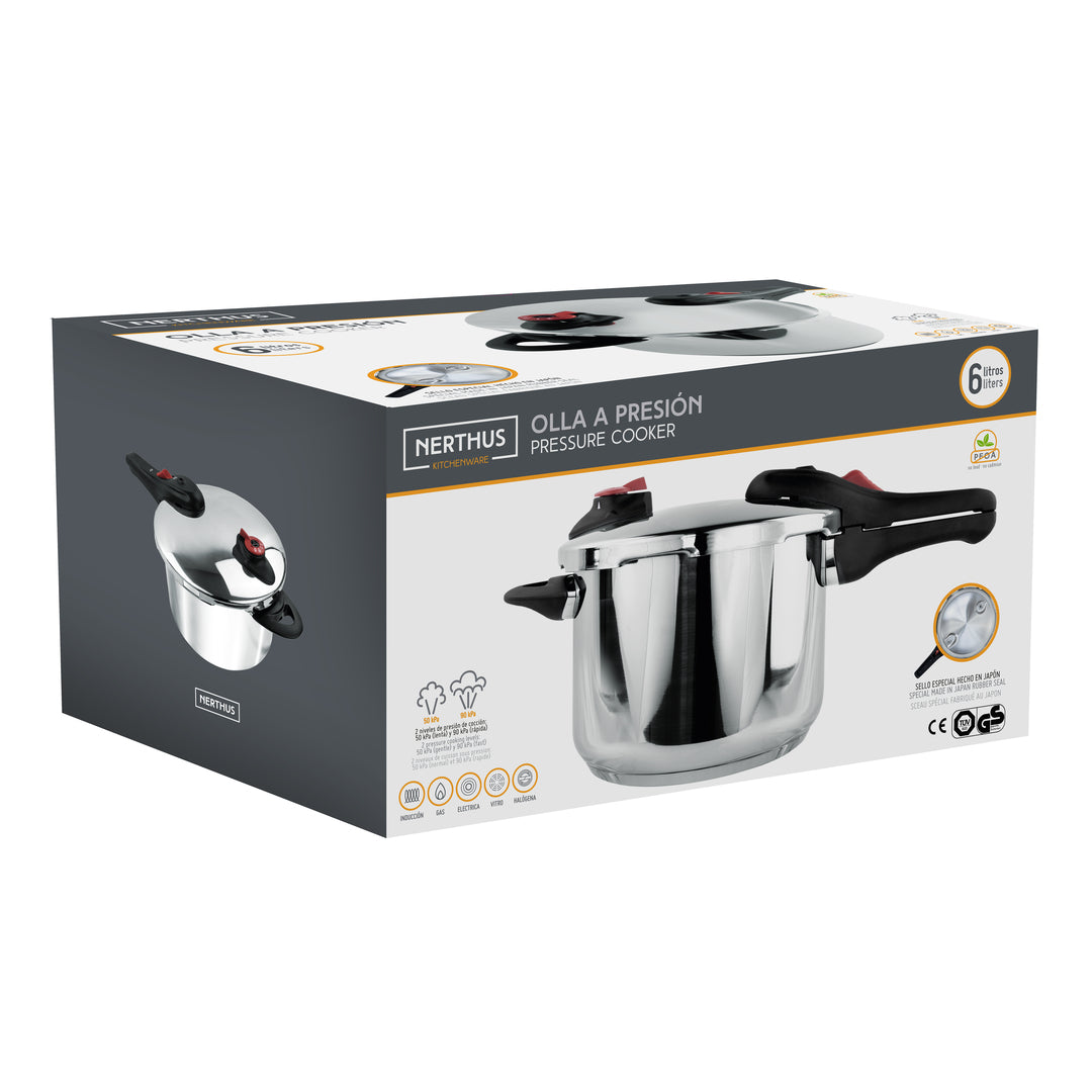 La Olla a Presión Nerthus FIH 1582 de 6 litros está diseñada para cocinar de forma rápida, segura y saludable, conservando al máximo los nutrientes y sabores de los alimentos.